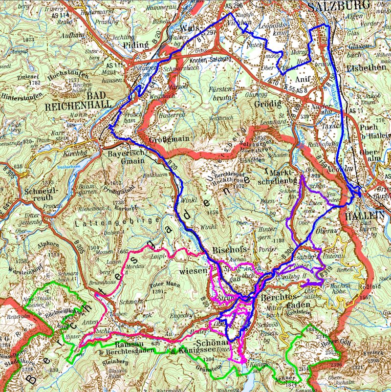 dann an der Salzach entlang bis zum Pfleger und anschliessend über Reichenhall und den Pass Hallthurm wieder zurück.