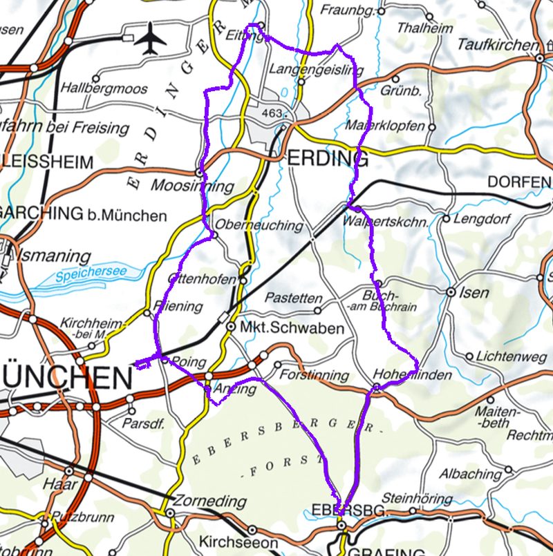 Buch, Mittbach, Hohenlinden, Ebersberg, Schwaberwegen und Anzing nach 97 km und 537 HM wieder zurück nach Poing.